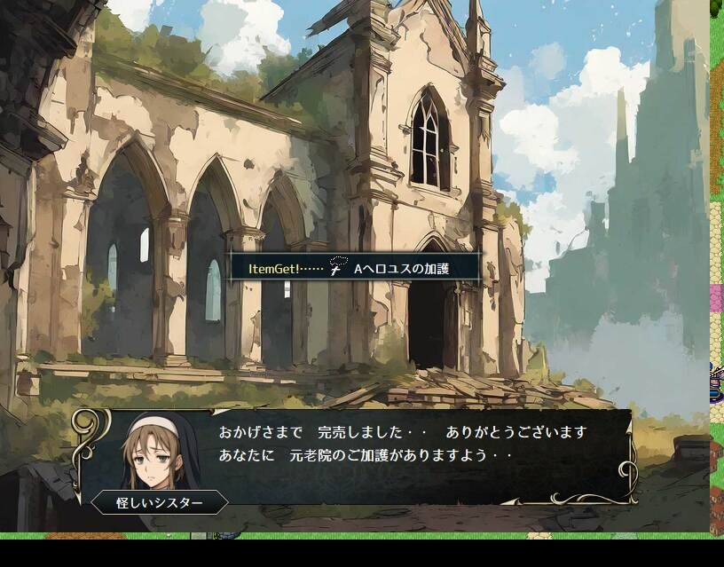教会:ちから/しゅび/まりょく/まぼうウォーター(各1000G)、(全て購入すると)ヘロユスの加護