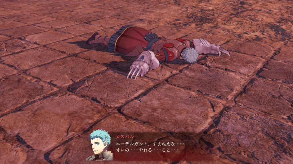早速、エーギル公への追撃を防ごうとして散るカスパル。